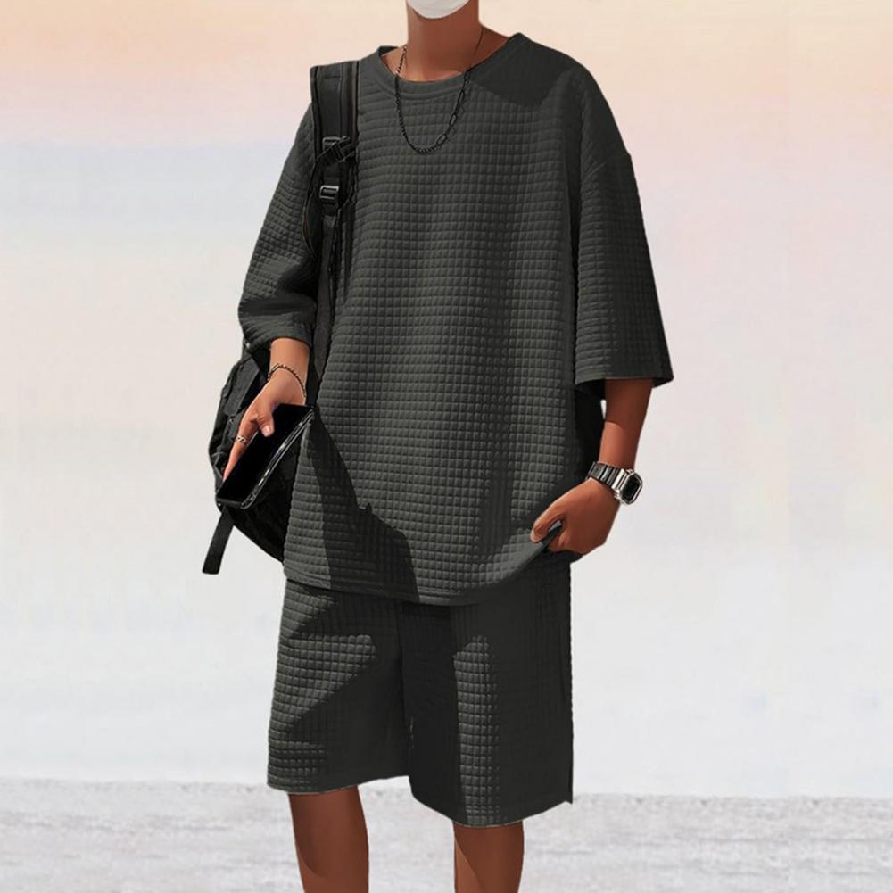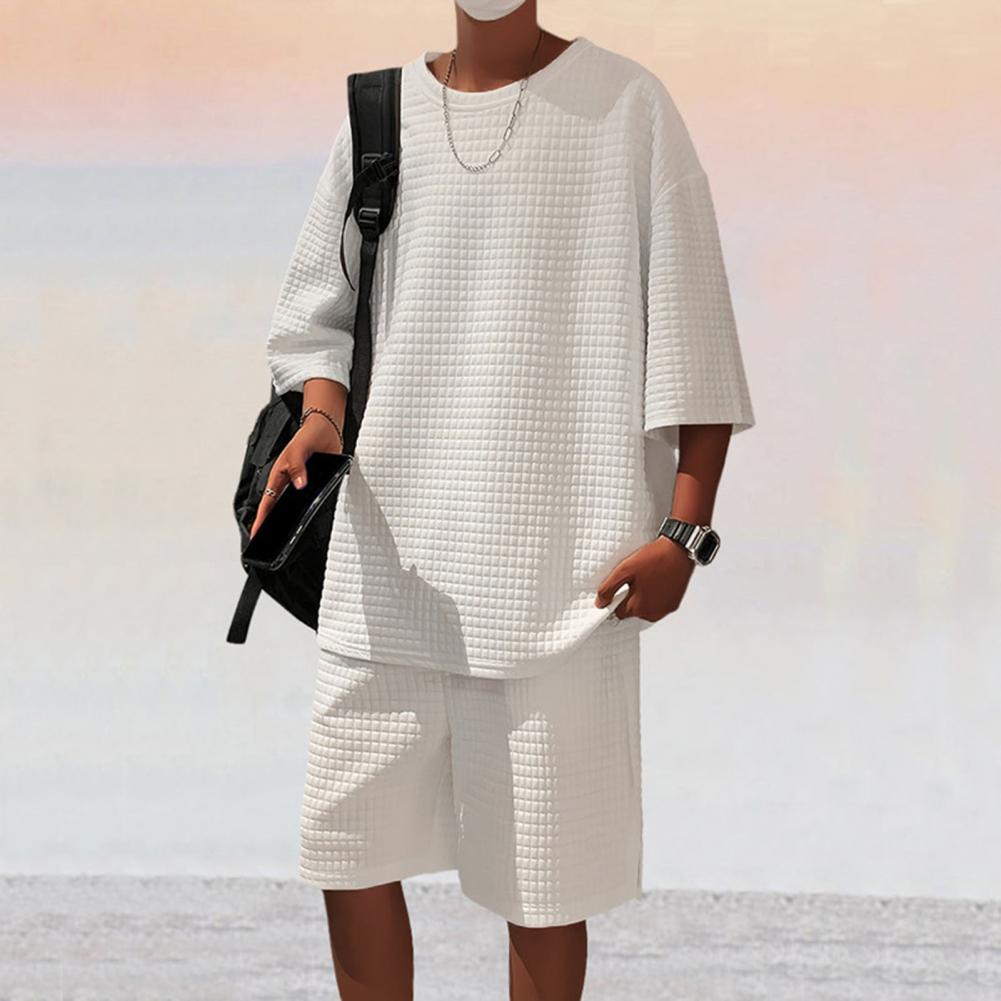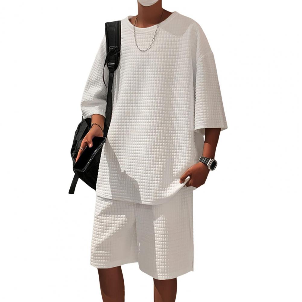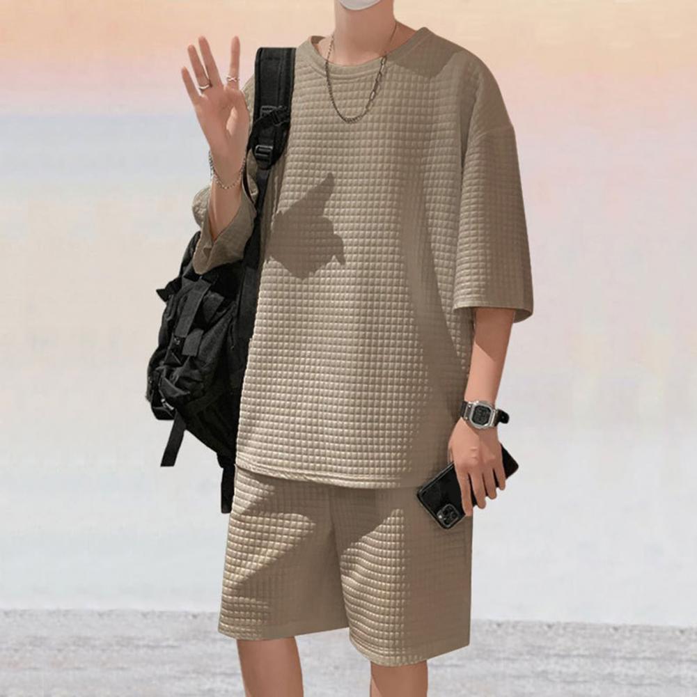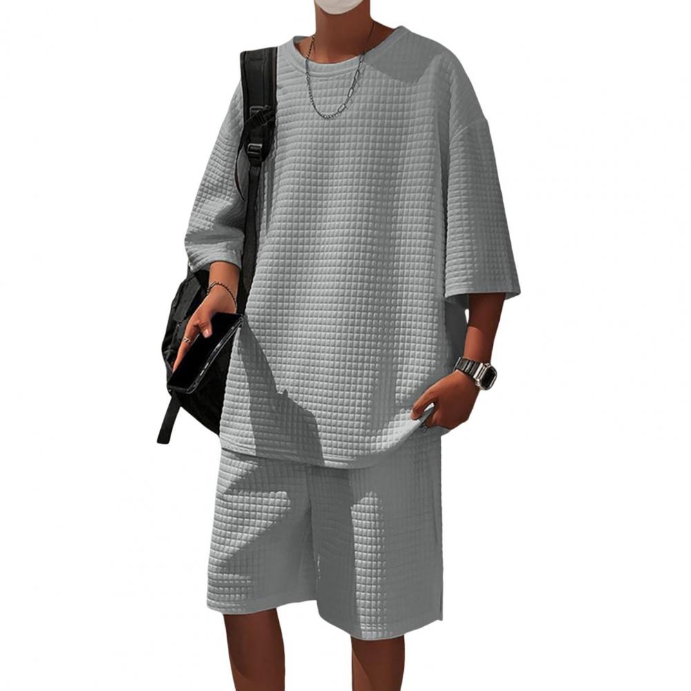 2Pcs/Set Men Summer Outfit O-neck Short Sleeve T-shirt Elastic Waist Wide Leg Pockets Shorts Set Solid Color Waffle Texture Sport Outfit