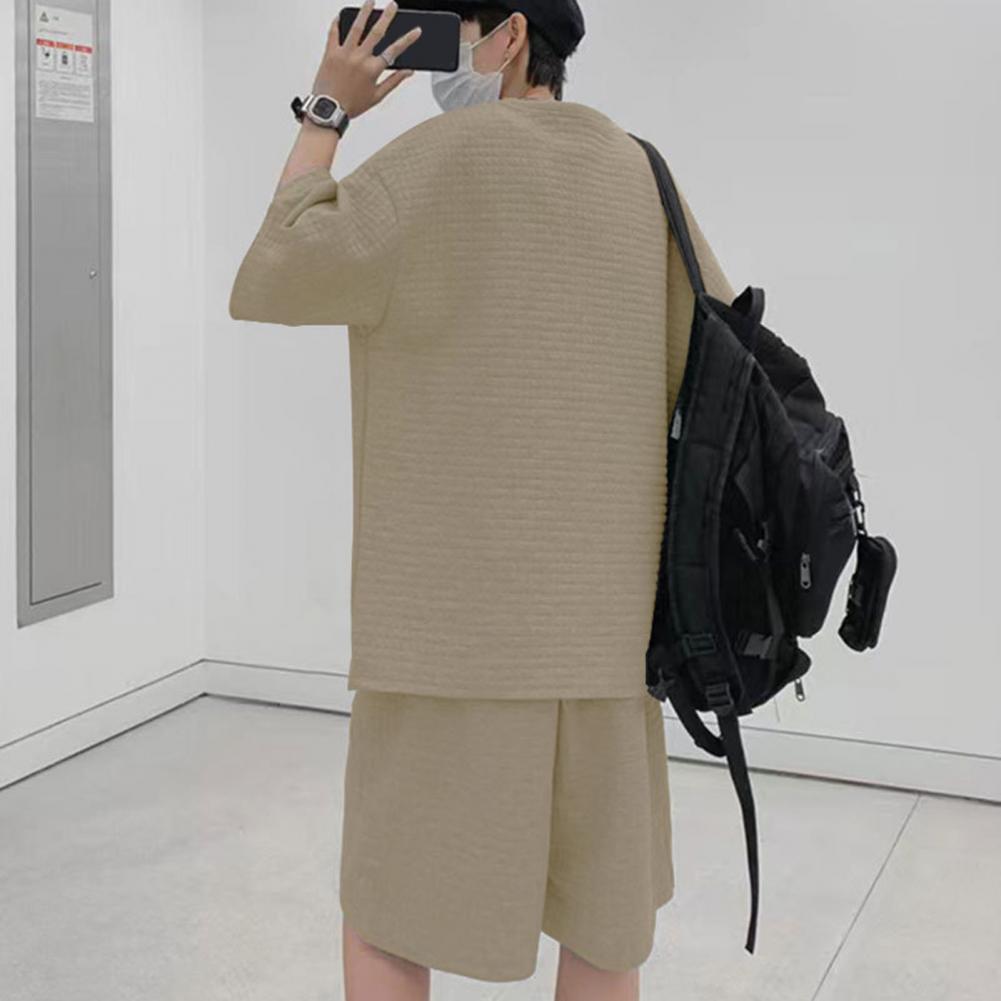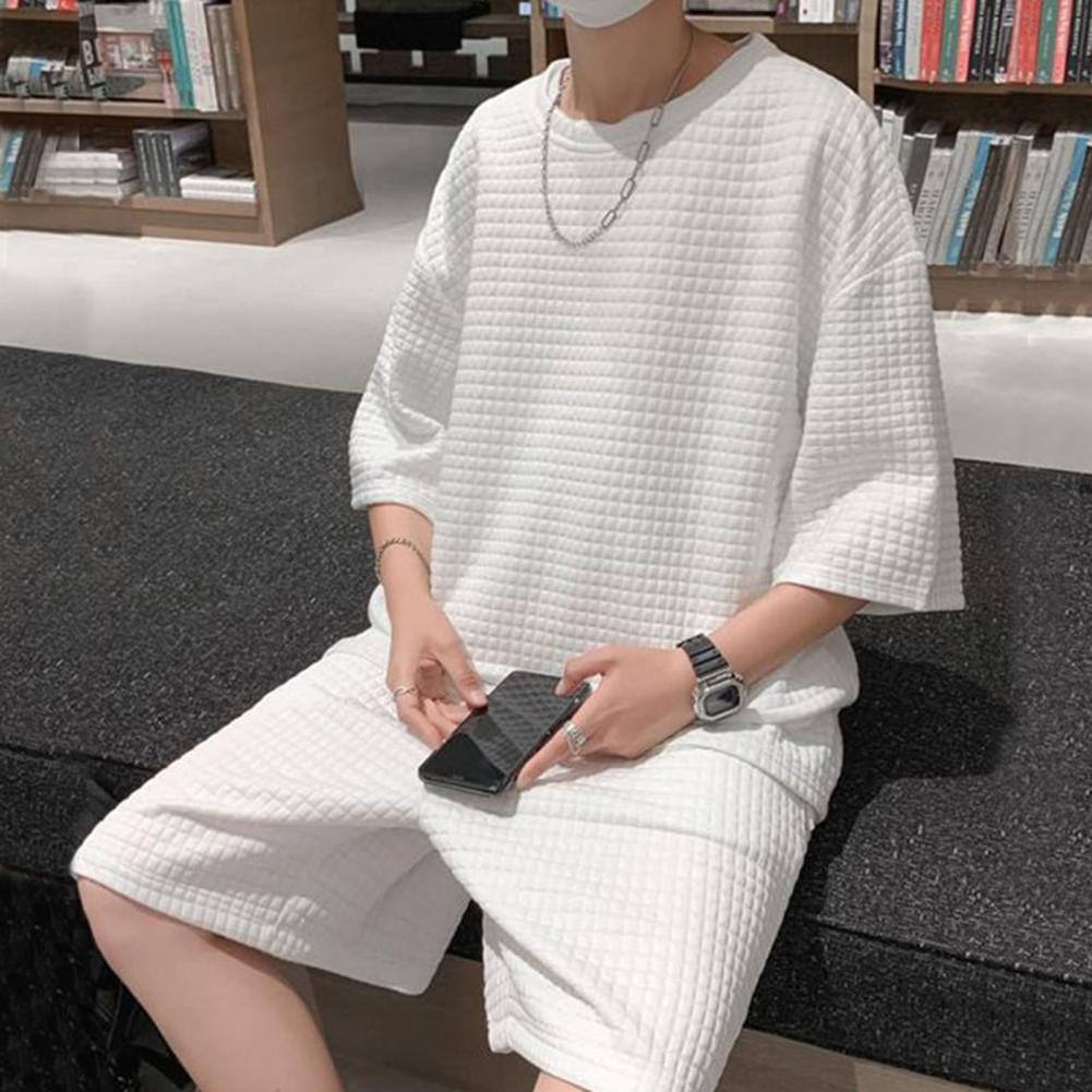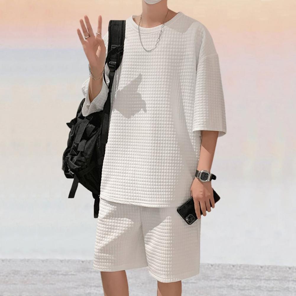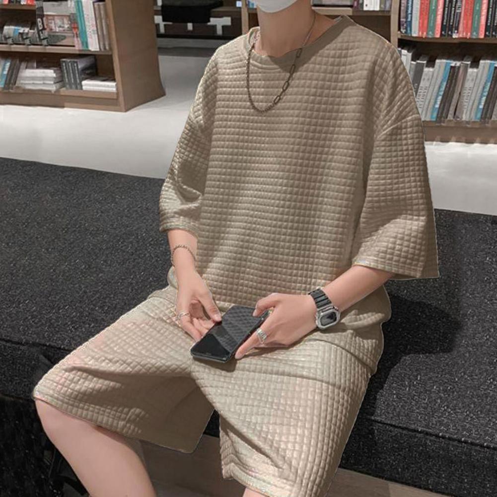Simple Elegance: The design of this men's suit exudes simplicity and elegance, featuring a short-sleeved top and elastic-waisted shorts with meticulous square fabric details, perfect for a laid-back yet stylish look.