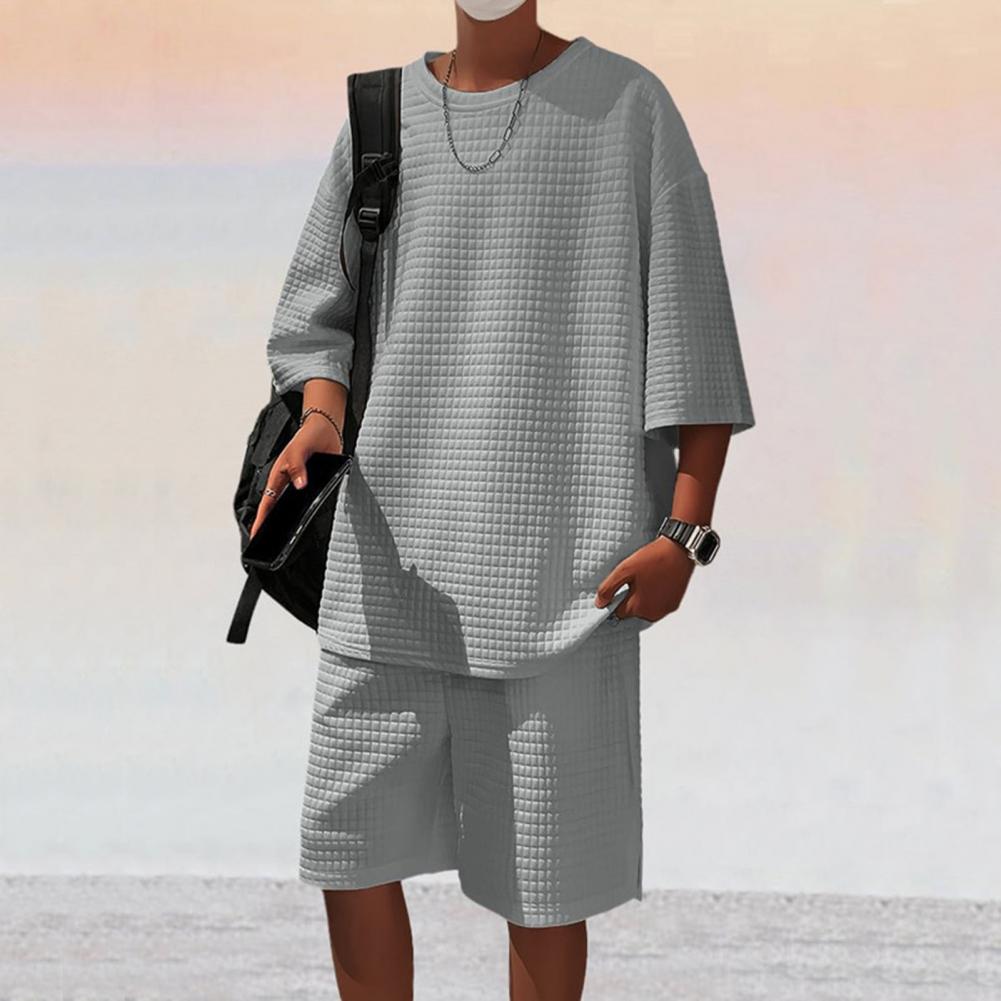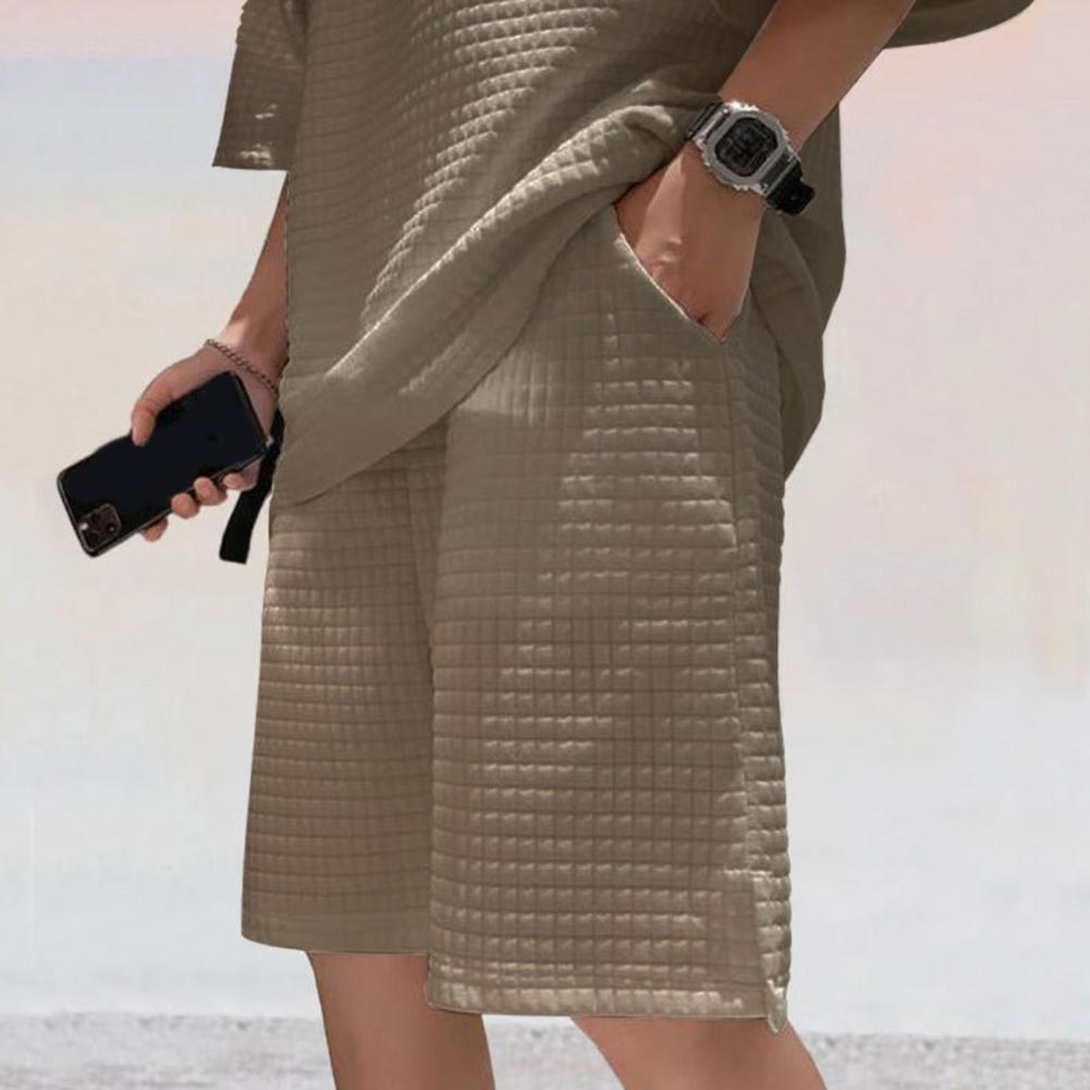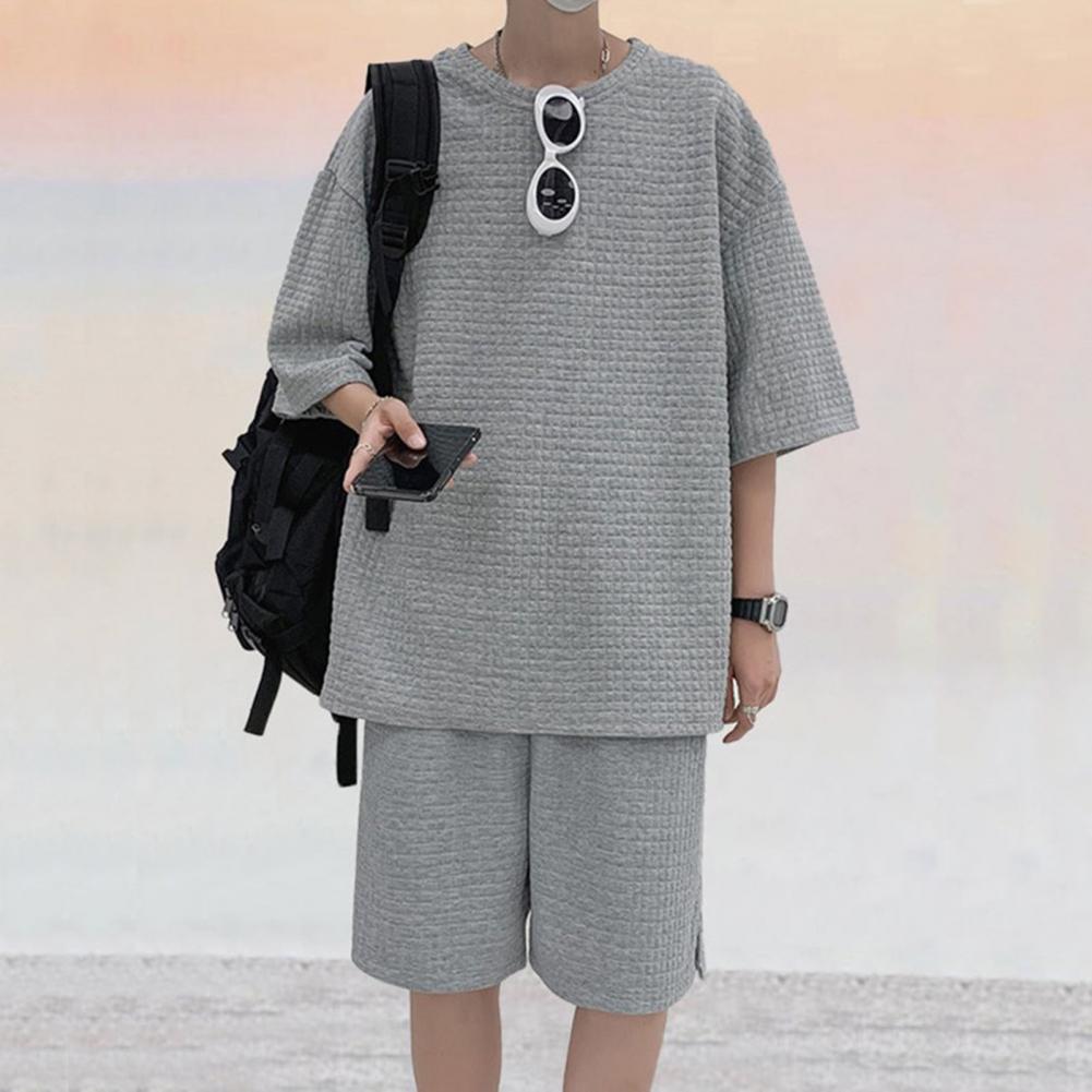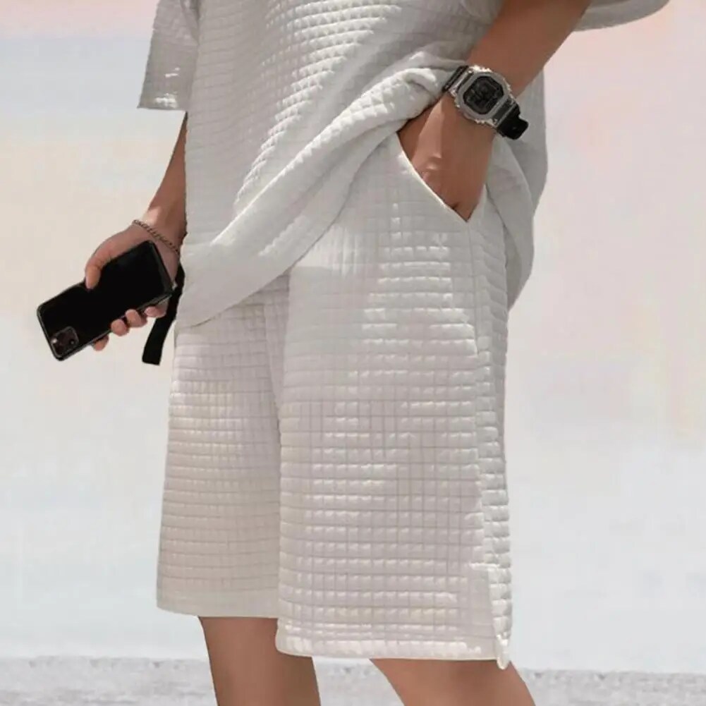 Simple Elegance: The design of this men's suit exudes simplicity and elegance, featuring a short-sleeved top and elastic-waisted shorts with meticulous square fabric details, perfect for a laid-back yet stylish look.