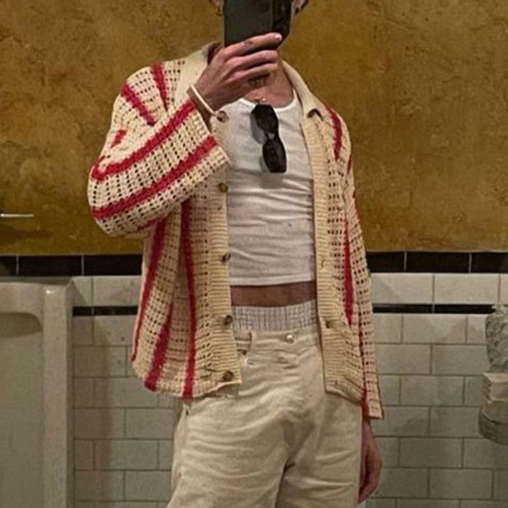 Fall Spring Men Cardigan Shirt Knitted Hollow Out Turn-down Collar Single-breasted Loose Long Sleeves Color Matching Slicing Patchwork Coat