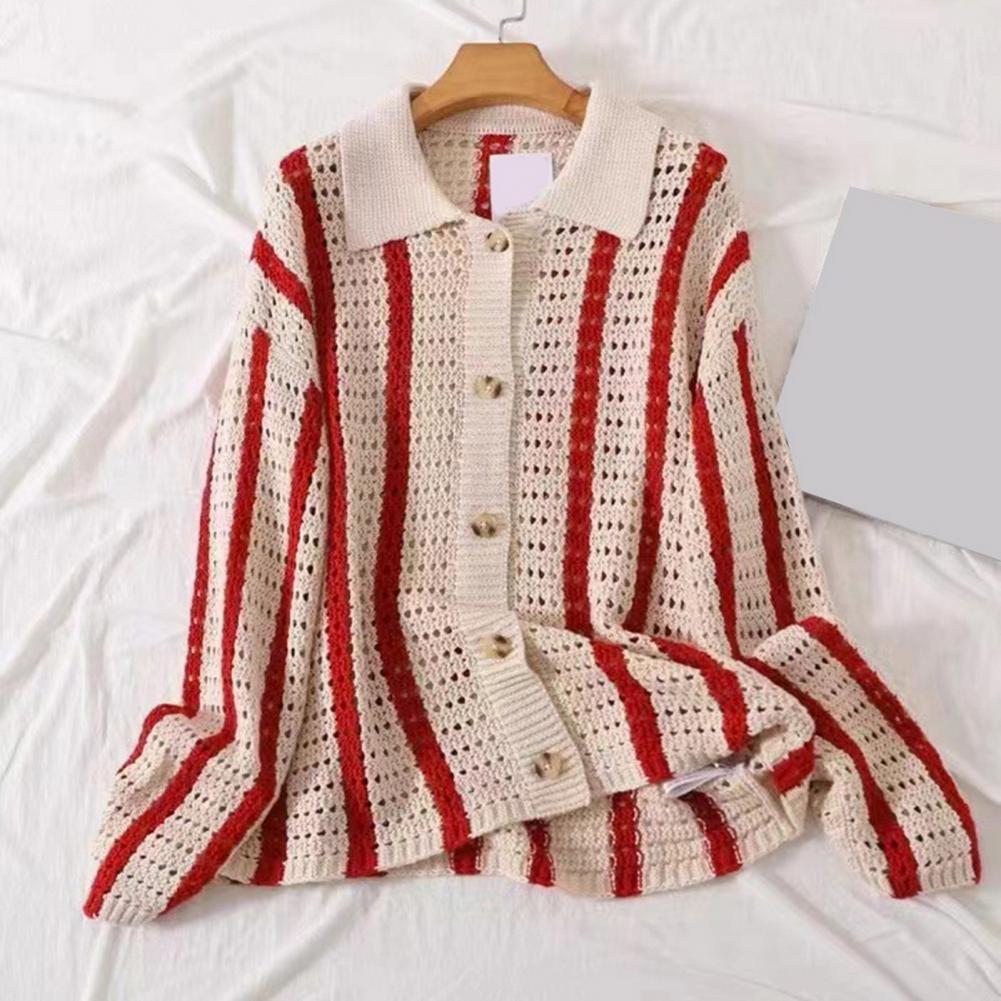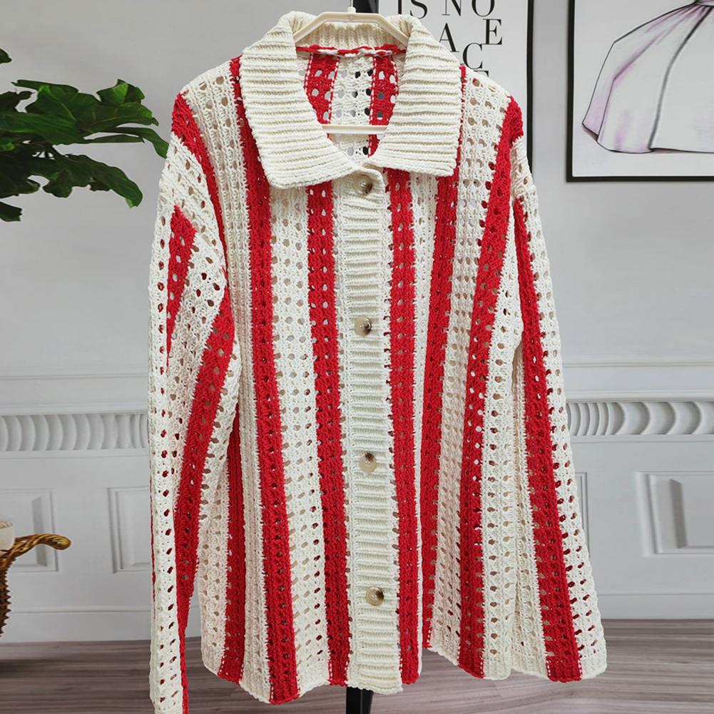 Stay ahead in fashion with the lapel design and long sleeves of this cardigan, featuring a single-breasted closure and eye-catching red vertical stripes decoration that exudes a fashion-forward personality.