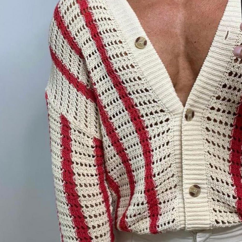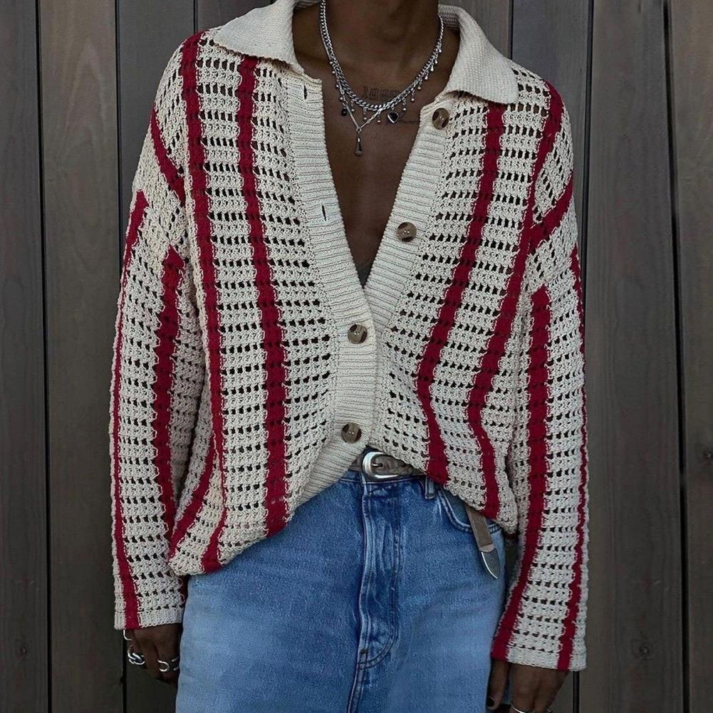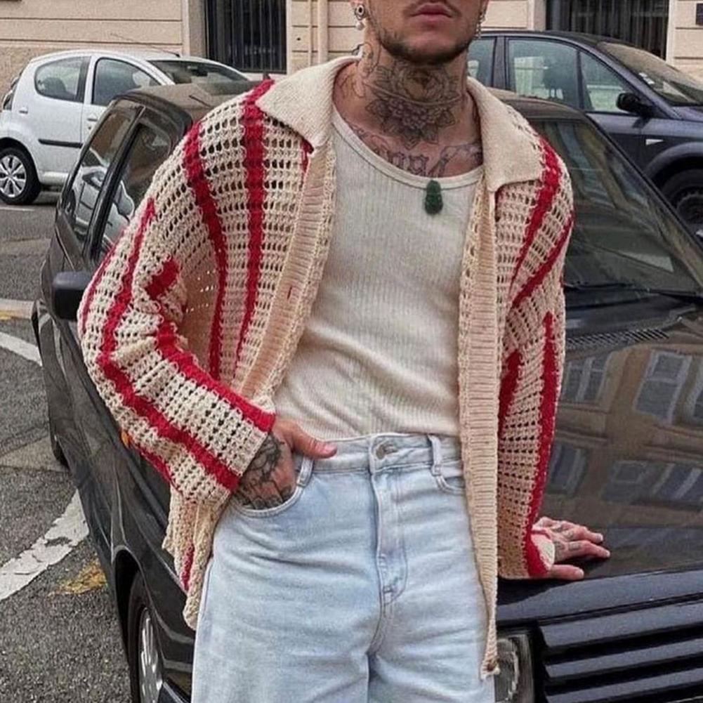 Enhance your wardrobe with this stylish men's red striped cardigan knit coat. The lapel design and long sleeves exude a fashion-forward personality, while the single-breasted closure adds a touch of sophistication. The red vertical stripes decoration elevates the overall look, making it perfect for a street-style ensemble.