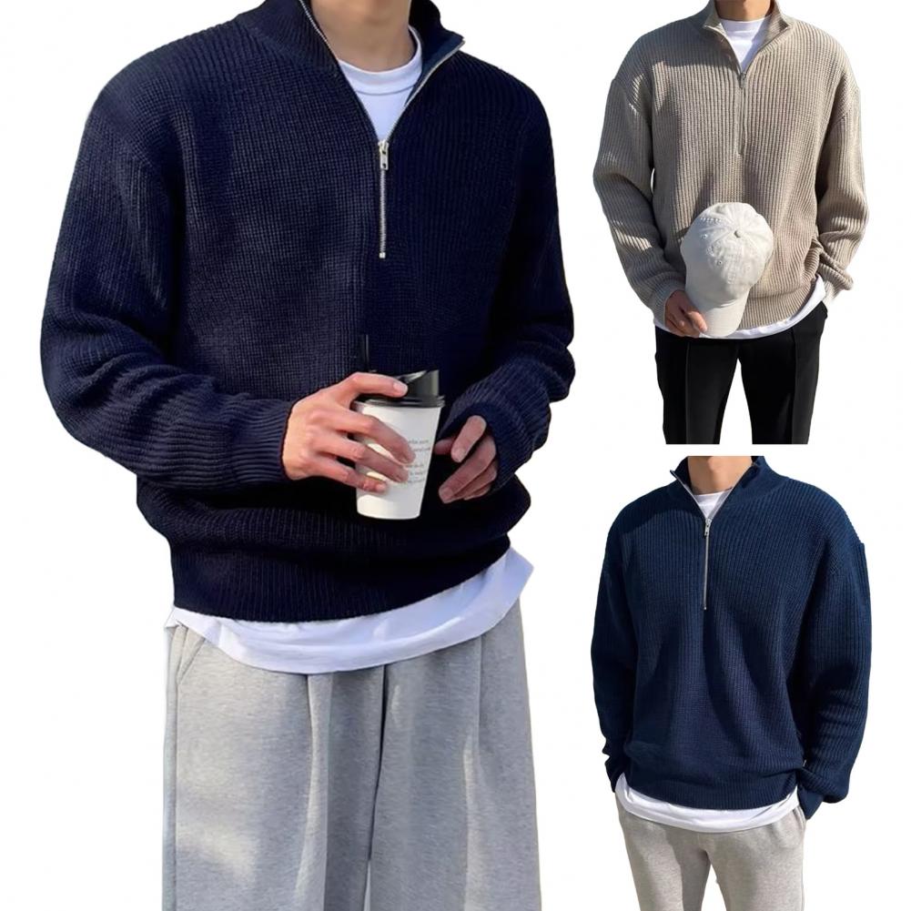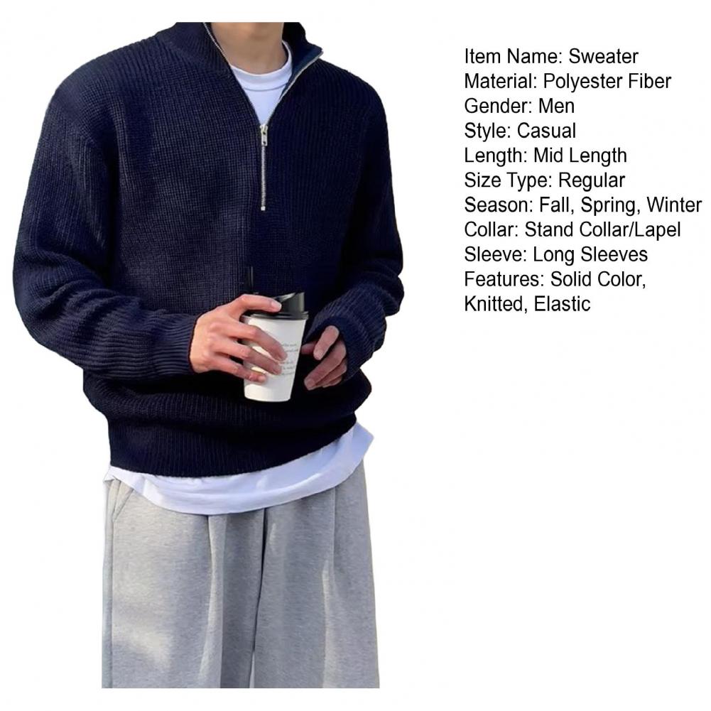 Men Fall Winter Sweater Half Zipper Stand Collar Elastic Knitted Pure Color Pullover Loose Long Sleeves Casual Work School Outdoor Sweater