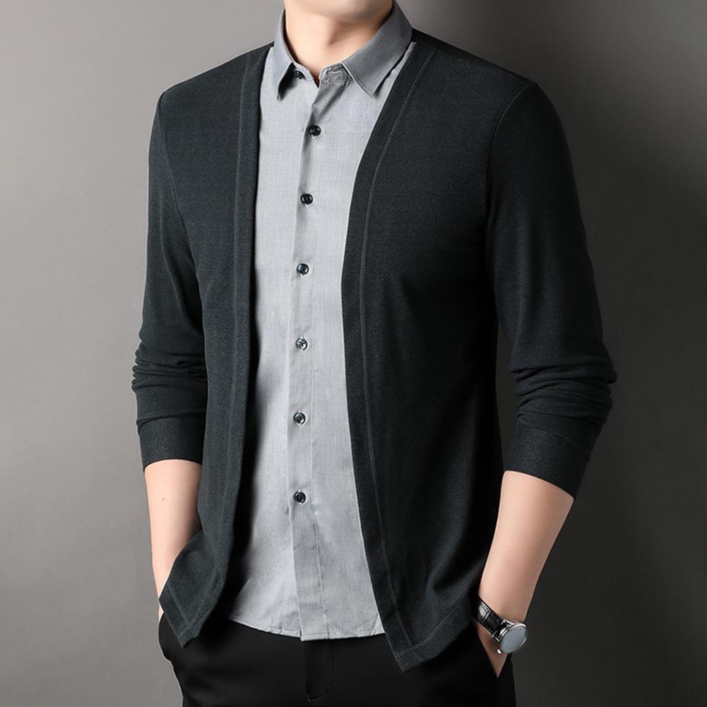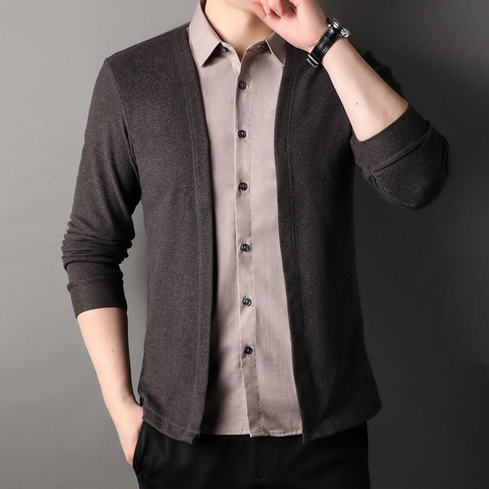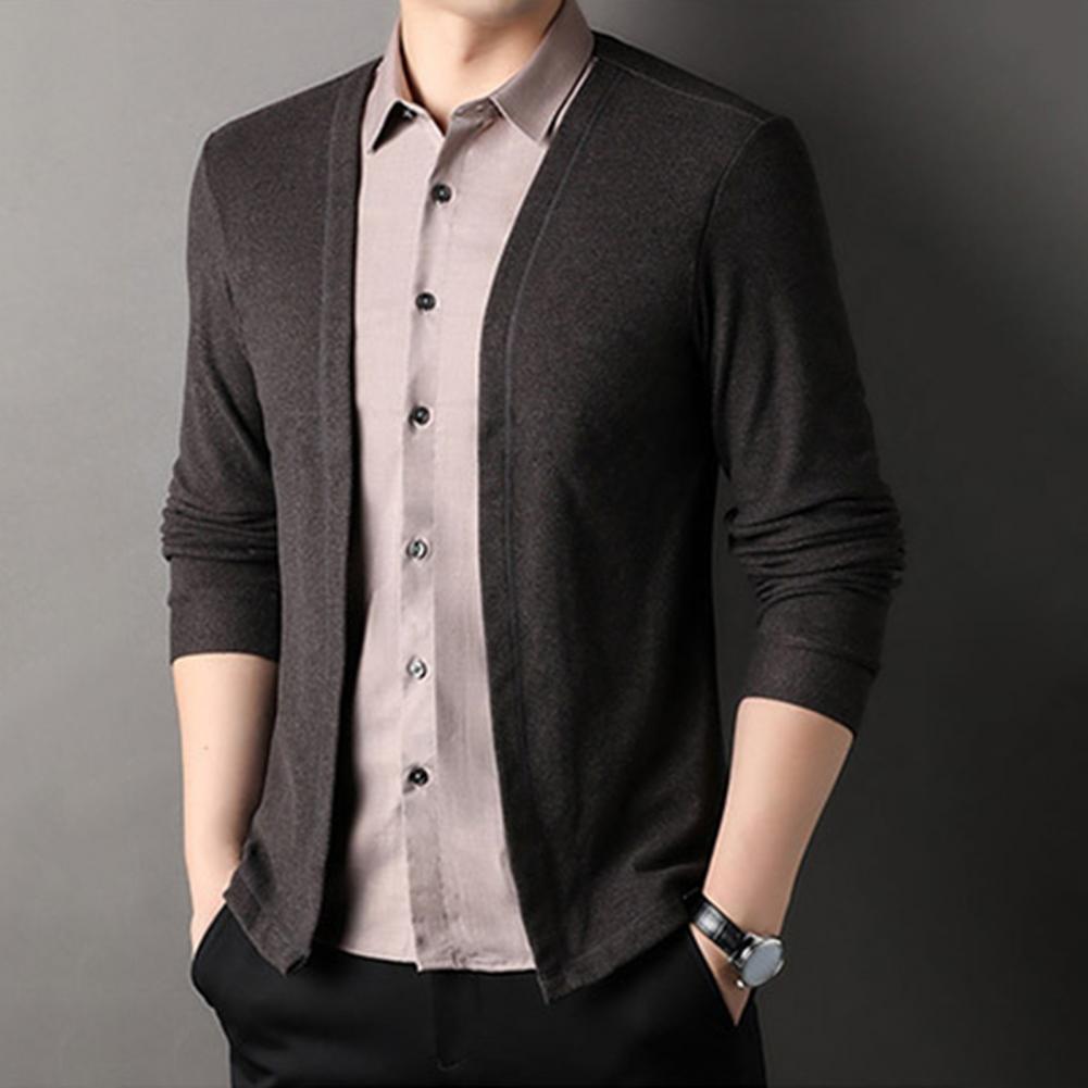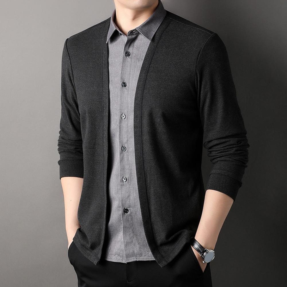 Introducing the Men's Fake Two Piece Lapel Long Sleeve Sweater Fashionable Casual cardigan, a versatile addition to your wardrobe. This solid color cardigan is perfect for various occasions, whether it's daily life, work, or a casual outing. The unique fake two-piece design gives it a stylish edge, with the inner layer resembling a shirt and the outer layer a classic cardigan.