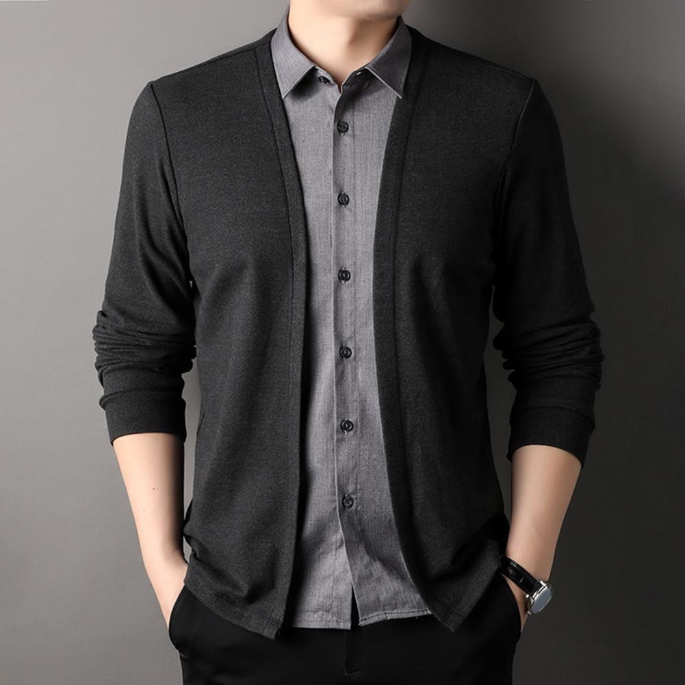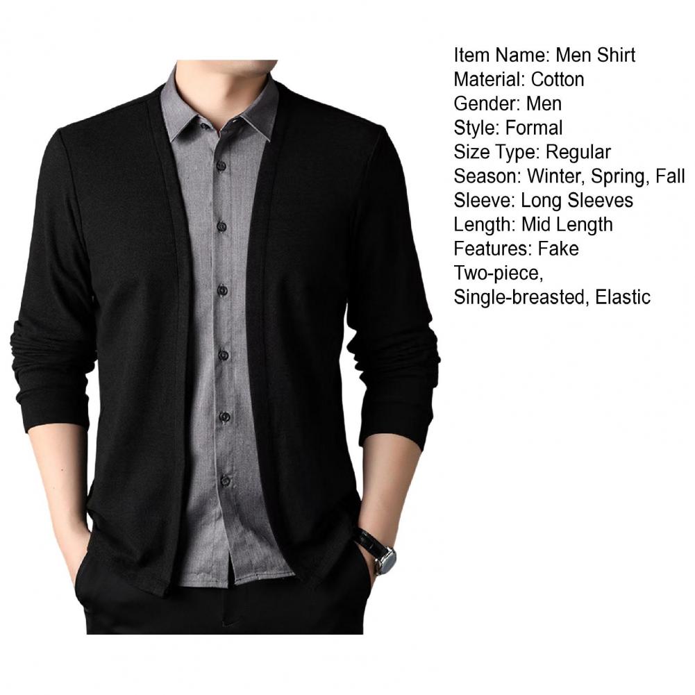 Men Shirt Fake Two-piece Cardigan Turn-down Collar Single-breasted Long Sleeves Color Matching Knitted Formal Business Style Top