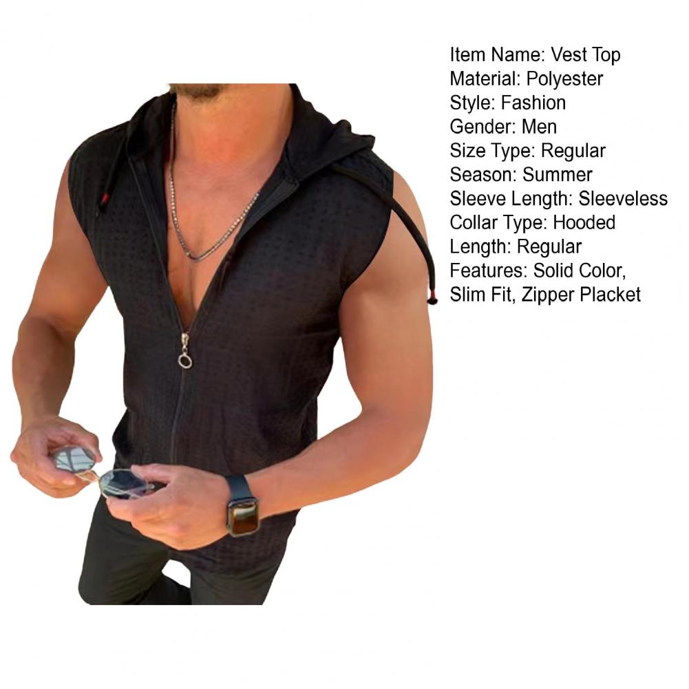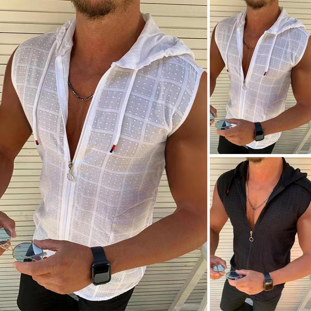 • New Men's Fashion Summer Beach Wind Sleeveless Zipper Hooded T-shirt Casual Beach Tank Hooded Beach Sun-protective Clothing